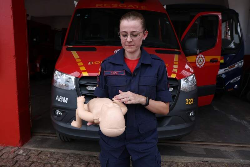 A soldado Koch, que integra o CBMRS e também é graduada em enfermagem, explicou o passo a passo para o desengasgo de bebês. O processo envolve manobras específicas e exige alguns cuidados. Embora trate-se de uma situação delicada, a primeira dica é manter a calma.