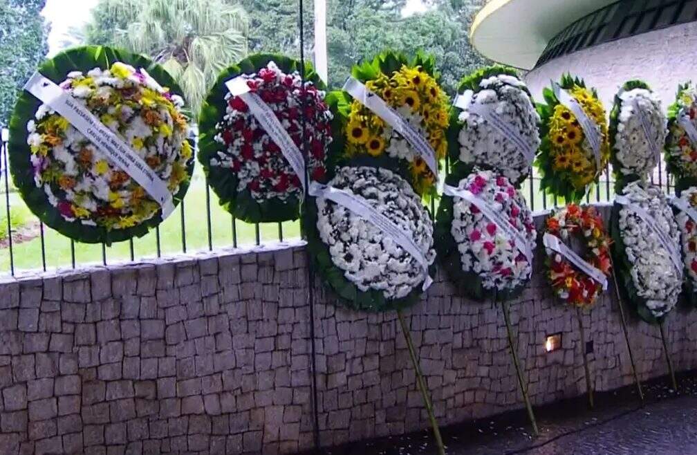 Diversas coroas de flores foram enviadas ao Ibirapuera por fãs, amigos e familiares da cantora. (Foto: Reprodução de TV)
