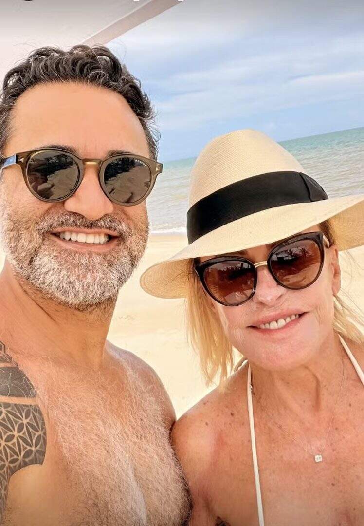 Ana Maria Braga, de 76 anos de idade, aproveitou o sábado (22) para se bronzear com o marido, Fábio Arruda, de 54 anos. Os dois viajaram para o litoral logo após o fim do Mais Você na sexta-feira (21) e posaram juntos em um cenário paradisíaco durante o dia. Ela usou um biquíni branco, chapéu bege, óculos escuros e caprichou no protetor solar.