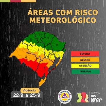Segundo a Defesa Civil, na noite deste domingo (22), uma nova frente fria, associada a uma baixa pressão na Argentina, se aproxima do Estado pelo Uruguai, trazendo chuvas fortes, temporais isolados, descargas elétricas e possível granizo, especialmente na Campanha, Sul e Costa Doce, com volumes de 25 a 50 mm/dia e rajadas de vento acima de 80 km/h.