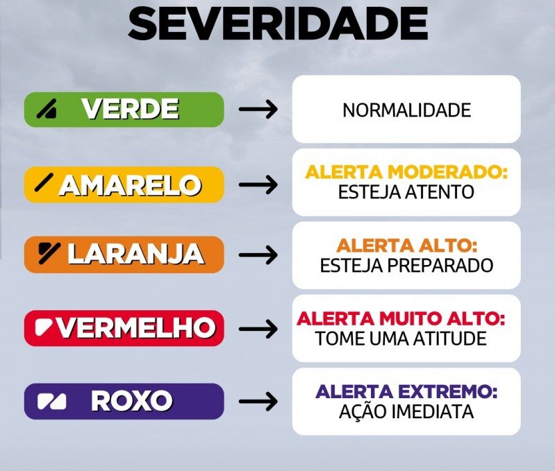 O sistema já está integrado aos comunicados oficiais publicados no site e nas redes sociais da Defesa Civil. A escala tradicional de cores — verde (normalidade), amarelo (alerta moderado), laranja (alerta alto), vermelho (alerta severo) e roxo (ação imediata) — passa a ser acompanhada dos símbolos gráficos, ampliando a compreensão.