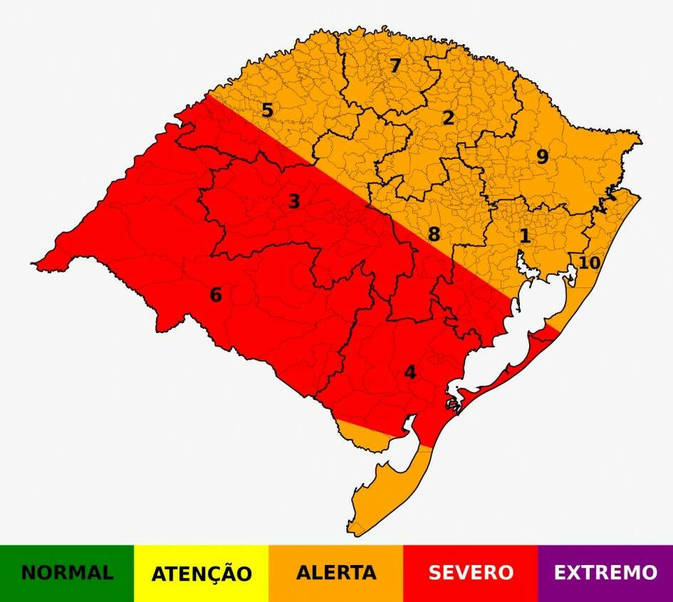 A previsão é de volumes bastante expressivos, por isso a condição é de alerta Vermelho – ou seja, muito alto – nas áreas mais a Oeste e do Centro até o Sudeste do Estado. Os maiores volumes, que irão variar de 200 a 300 milímetros (mm), se concentrarão mais a Oeste.
