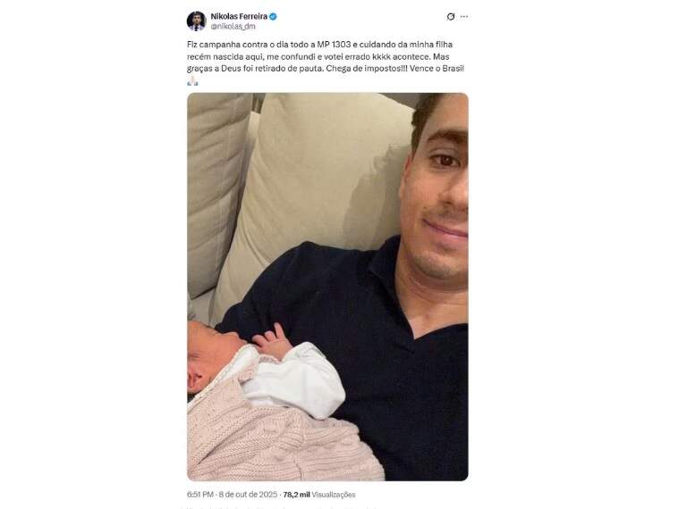 “Fiz campanha contra o dia todo a MP 1303 e cuidando da minha filha recém nascida aqui, me confundi e votei errado kkkk acontece”, publicou o deputado mineiro. “Graças a Deus foi retirado de pauta. Chega de impostos!!! Vence o Brasil”, completou o parlamentar no post.