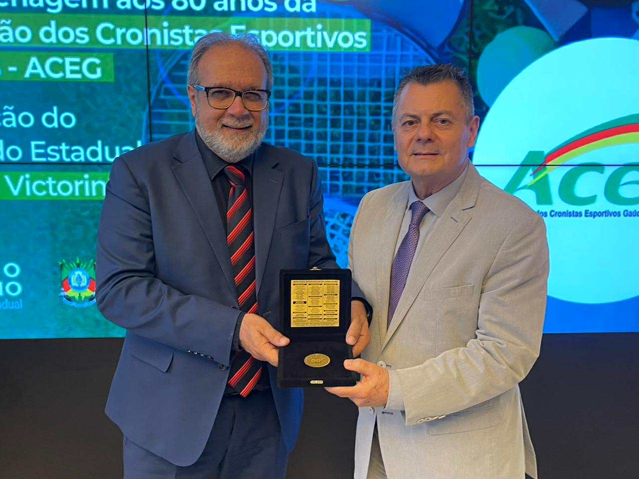 Em solenidade realizada segunda-feira (13), no Salão Júlio de Castilhos da Assembleia Legislativa, o deputado Gustavo Victorino (Republicanos) homenageou os 80 anos da ACEG (Associação dos Cronistas Esportivos Gaúchos) com a entrega da Medalha da 56ª Legislatura.