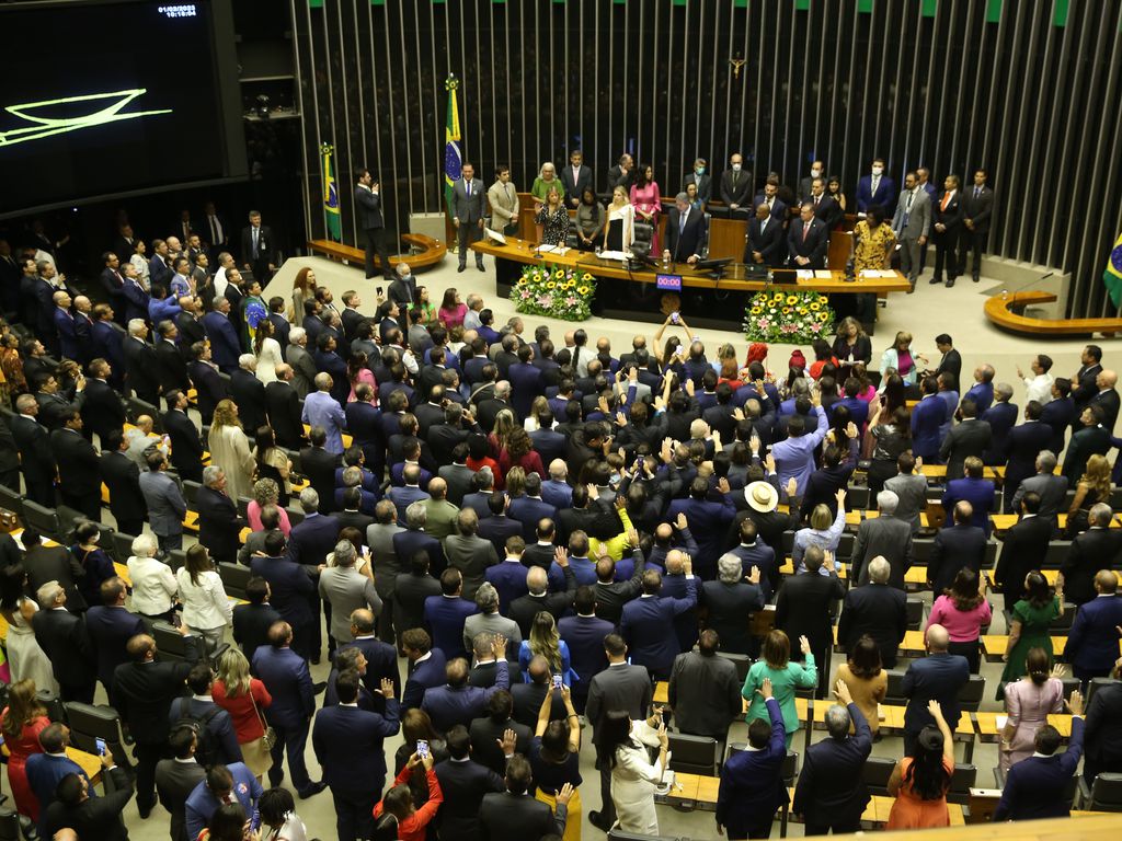 Deputados federais eleitos em outubro de 2022 tomaram posse nesta quarta-feira (1º) em cerimônia no plenário principal da Câmara. Segundo a Câmara, dos 513 deputados eleitos, 202 assumem o mandato pela primeira vez.