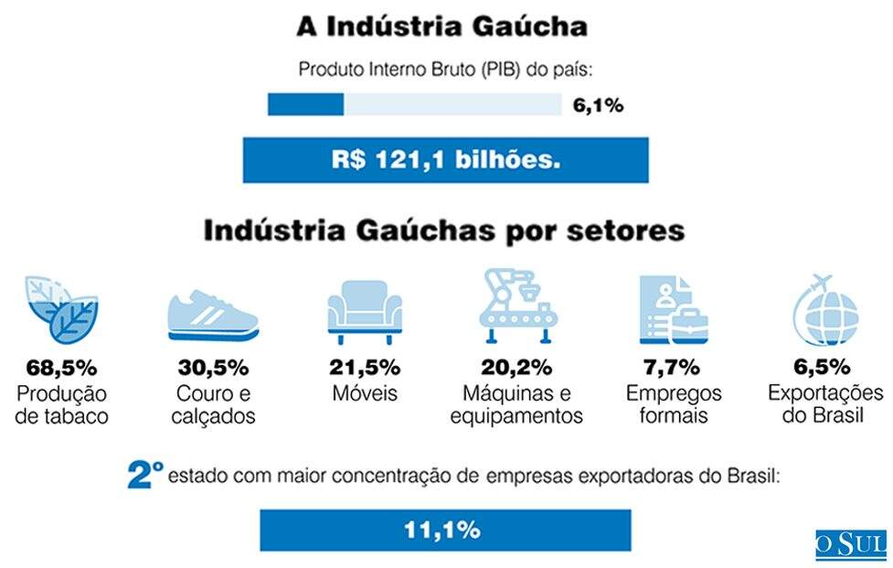 A indústria gaúcha também tem notável relevância nacional, ao representar, de acordo com a Fiergs, 6,1% do Produto Interno Bruto (PIB) do país, movimentando R$ 121,1 bilhões ao ano. O setor estadual também é responsável por 7,7% dos empregos formais e 6,5% das exportações no Brasil, exportando para 160 países.