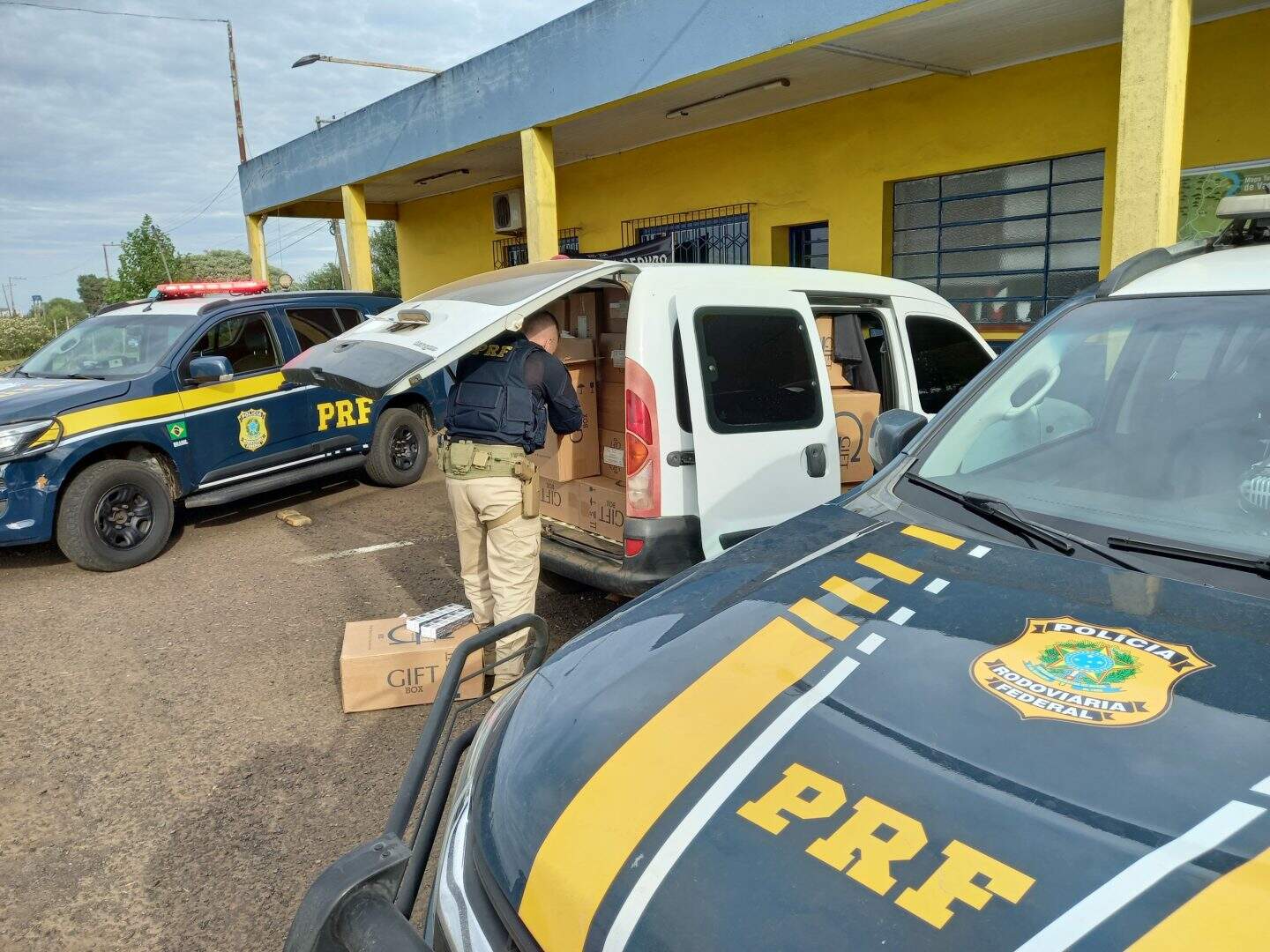 Durante operação de combate a sonegação no posto fiscal do Passo do Socorro, a PRF foi acionada para prestar apoio aos agentes estaduais na abordagem de uma caminhonete Renault Kangoo, com placas de Maracajá/SC, que estava totalmente carregada com 16 mil maços de cigarros contrabandeados de origem estrangeira.