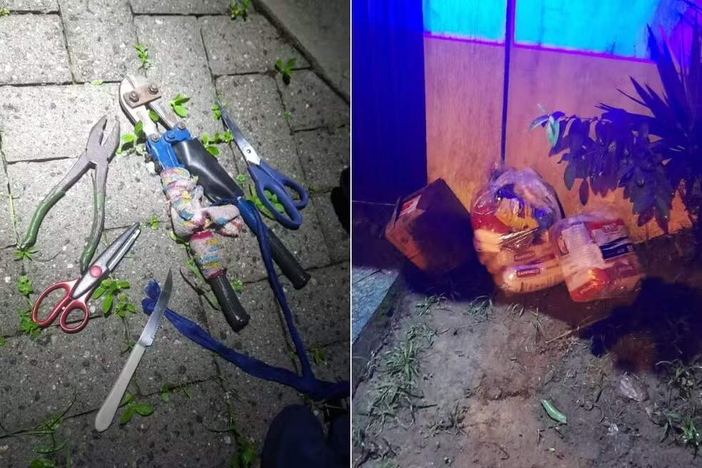 Dentro do ginásio, a dupla deixou uma mochila com alicates grandes, duas tesouras e uma faca. Segundo a prefeitura, as ferramentas foram usadas para arrombar as portas e quebrar os cadeados. Além disso, ainda de acordo com o município, os agentes encontraram outras duas bolsas com alimentos, assim como uma máquina de lavar que havia sido arrastada por eles até um corredor.