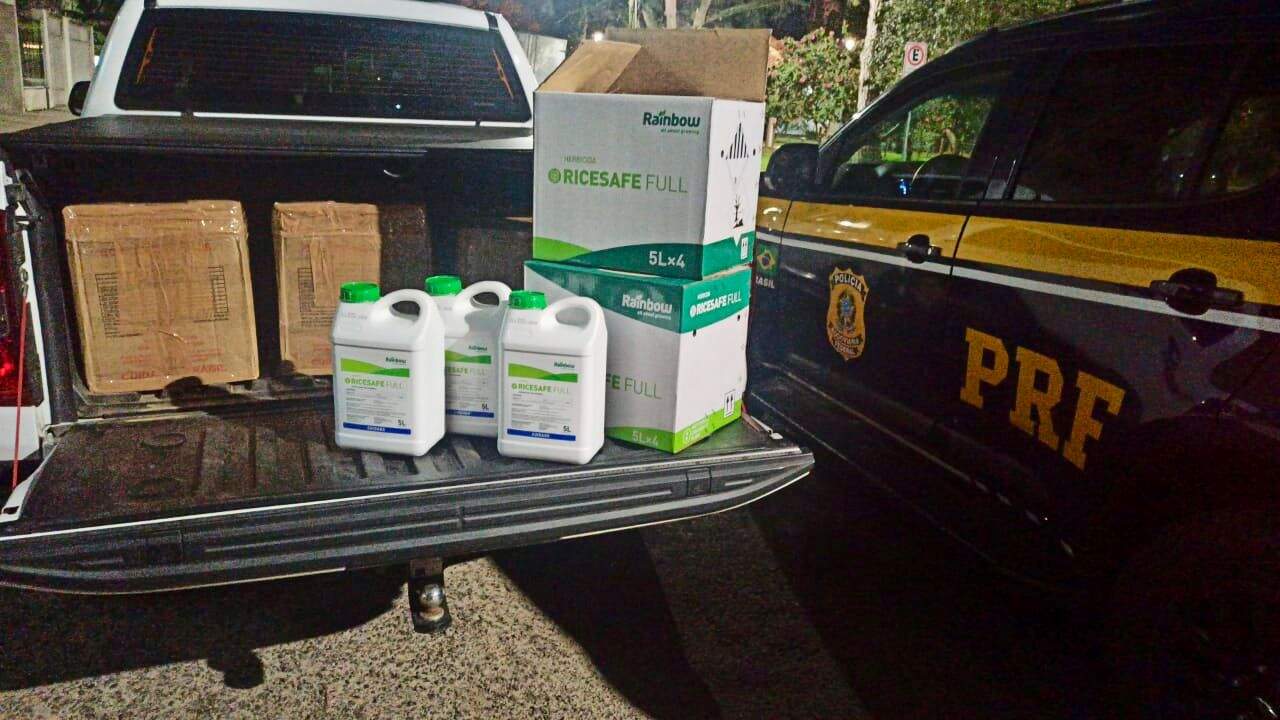 Durante ações de combate ao crime, policiais rodoviários federais abordaram uma Ranger, emplacada em Arroio do Silva/SC, ocupada por dois homens. Na caçamba do veículo havia diversos galões de agrotóxicos importados ilegalmente, totalizando 160 litros. O produto era feito de uma substância proibida no Brasil.