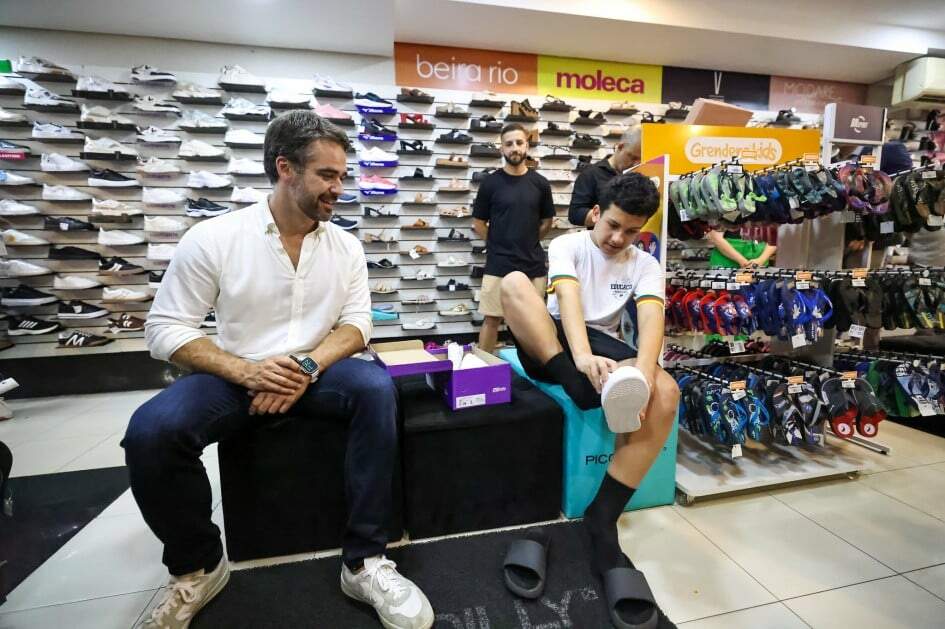 A polêmica do pé direito ou pé esquerdo para entrar no Ano Novo, travada nas redes sociais, foi mencionada pelo governador Eduardo Leite, que repetiu, na sua rede social do Instagram, o mantra de acender uma vela para o Dragão e outra para São Jorge, e aproveitou para promover, ao lado de Diogo, um dos alunos beneficiados, o lançamento do programa Pé no Futuro, iniciativa que vai garantir R$ 150 para cerca de 300 mil estudantes inscritos no CadÚnico comprarem novos tênis e meias para o ano letivo que inicia em 2026:
