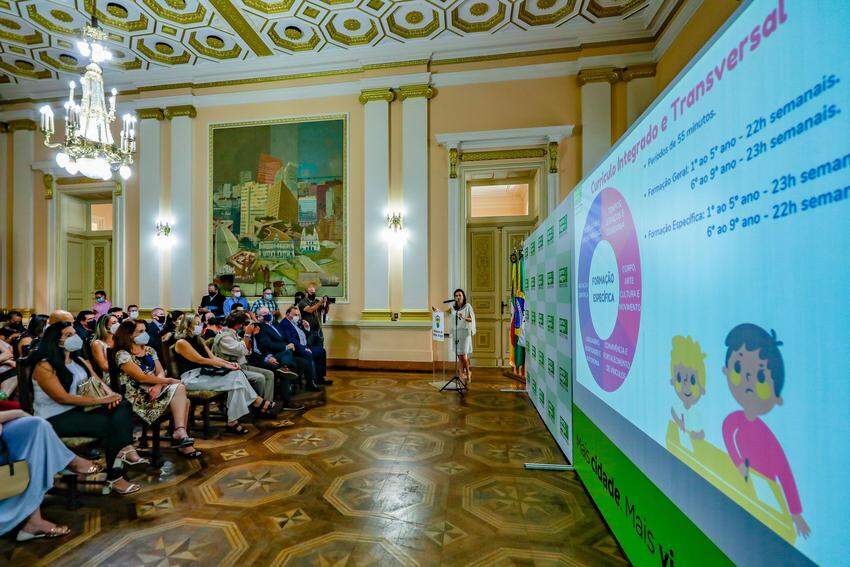 O prefeito em exercício de Porto Alegre, Idenir Cecchim, e a secretária municipal de Educação, Janaina Audino, apresentaram, nesta quarta-feira (16), no Paço Municipal, o Programa Mais Tempo na Escola. Cinco escolas municipais de ensino fundamental terão atendimento integral neste ano letivo, que começa na próxima segunda-feira (21). Todas as atividades pedagógicas serão ministradas por professores da rede municipal. Ao todo, cerca de 1,6 mil estudantes serão atendidos nove horas diárias, com cinco refeições.