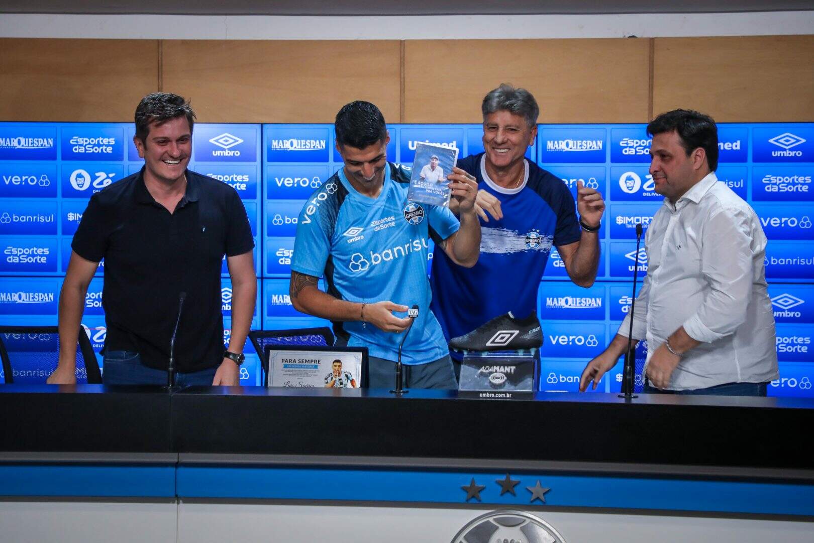 O domingo (03) marcou a despedida de um dos grandes jogadores que honraram a camisa do Grêmio. Após a vitória sobre o Vasco, em sua última partida na Arena, Luis Suárez participou de uma entrevista coletiva, recebeu uma placa de homenagem do clube, uma camisa especial e um presente curioso: um DVD de Renato Portaluppi com momentos marcantes da carreira do treinador como jogador.