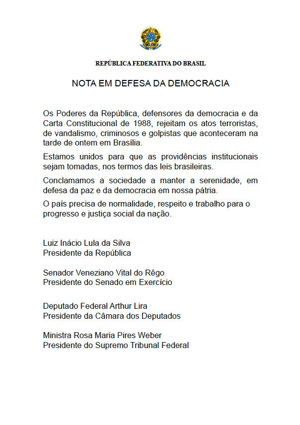 Os chefes dos Três Poderes divulgaram uma nota conjunta, na manhã desta segunda-feira (09), condenando os atos “terroristas, de vandalismo, criminosos e golpistas” realizados na tarde de domingo (08), em Brasília.