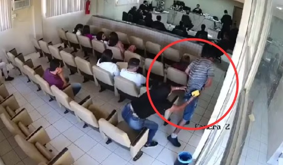 Logo no início do vídeo, o atirador (Cristiano) apareceu, inicialmente, sentado, acompanhando o júri ao lado de uma mulher, que não foi identificada. Pelo menos 20 pessoas estavam na sala no momento do crime, entre ouvintes, advogados e servidores do fórum.