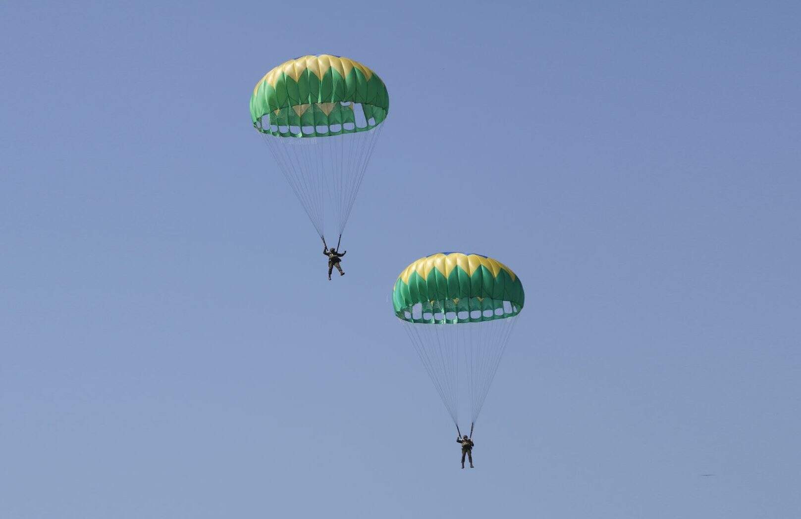 – Embarcações navais e paraquedistas descendo diretamente no Guaíba.