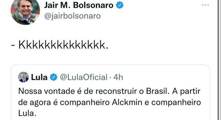 Em uma postagem nas redes sociais nesta sexta-feira (8), Bolsonaro compartilhou uma foto de Lula e Alckmin publicada pelo ex-presidente e riu da mensagem escrita pelo petista .“Nossa vontade é de reconstruir o Brasil. A partir de agora é companheiro Alckmin e companheiro Lula.”