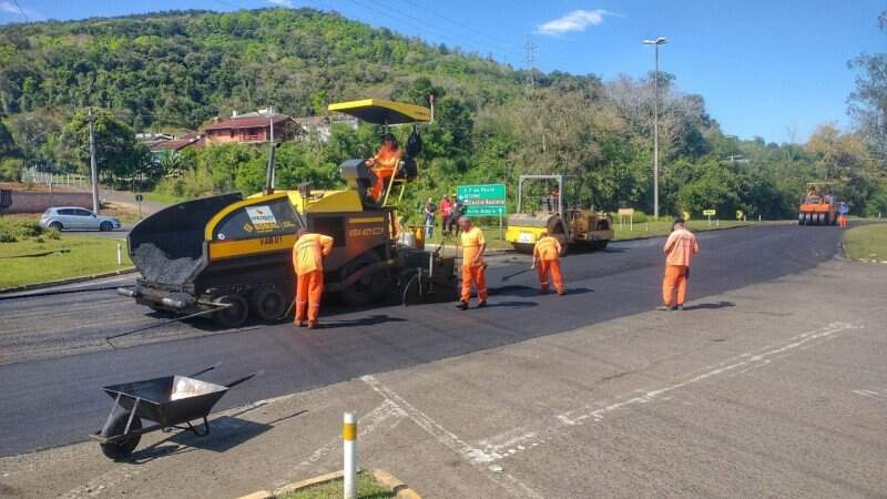 Nesta terça-feira (06), equipes técnicas realizaram os serviços de fresagem — trabalho que consiste na retirada do material asfáltico antigo para a colocação de uma nova camada na pista — entre os quilômetros 16 e 17, em duas rotatórias da ERS-115. As obras devem ser concluídas até o final desta semana.