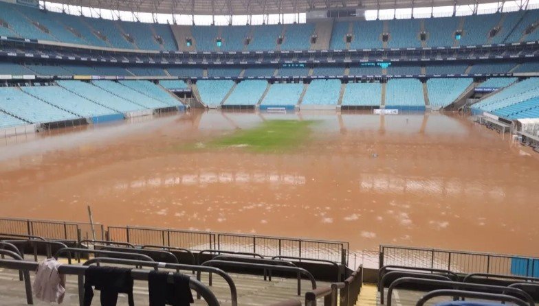 As chuvas no Rio Grande do Sul continuam castigando Porto Alegre e outras cidades do Estado. Nesse sábado (4), a água tomou conta da Arena do Grêmio, primeiro nos arredores do estádio e depois no gramado. Mais cedo, também houve alagamento no CT Luiz Carvalho. O ônibus do Tricolor ficou praticamente encoberto encoberto pela água das chuvas.