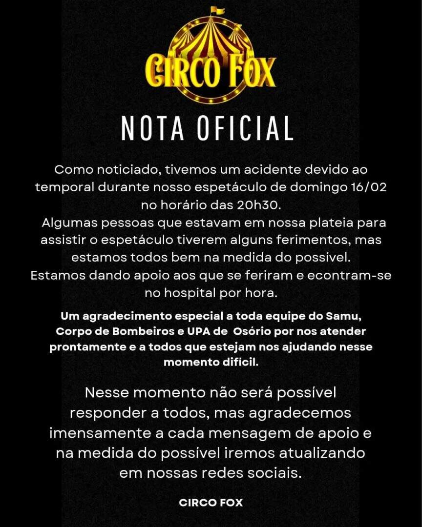 Todos os feridos estavam na plateia. Havia cerca de 200 pessoas no local no momento do desabamento, que ocorreu por volta das 20h30min. O Circo Fox divulgou uma nota sobre o ocorrido. Confira abaixo: