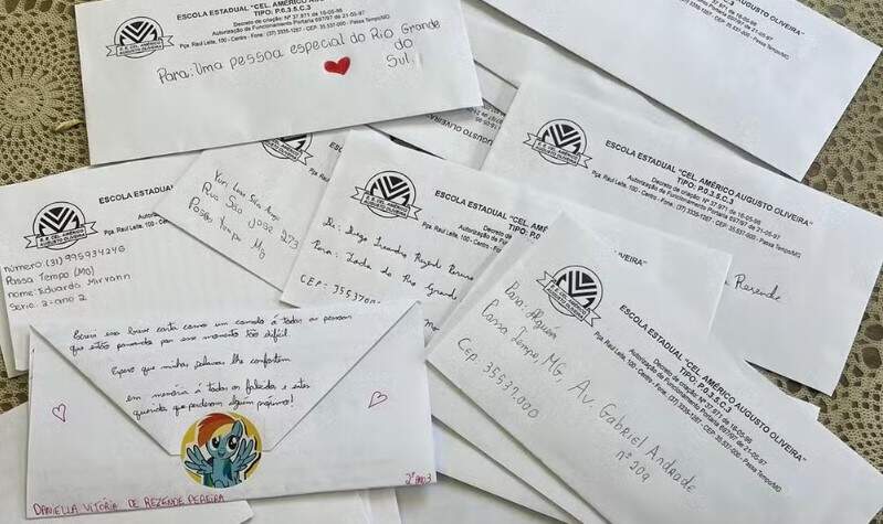 As cartas foram escritas a mão por 150 alunos, que têm entre 14 e 16 anos. “Tudo vai ficar bem”, “Meus pêsames por suas perdas”, “Amamos os gaúchos” estão entre as palavras elaboradas pelos adolescentes.