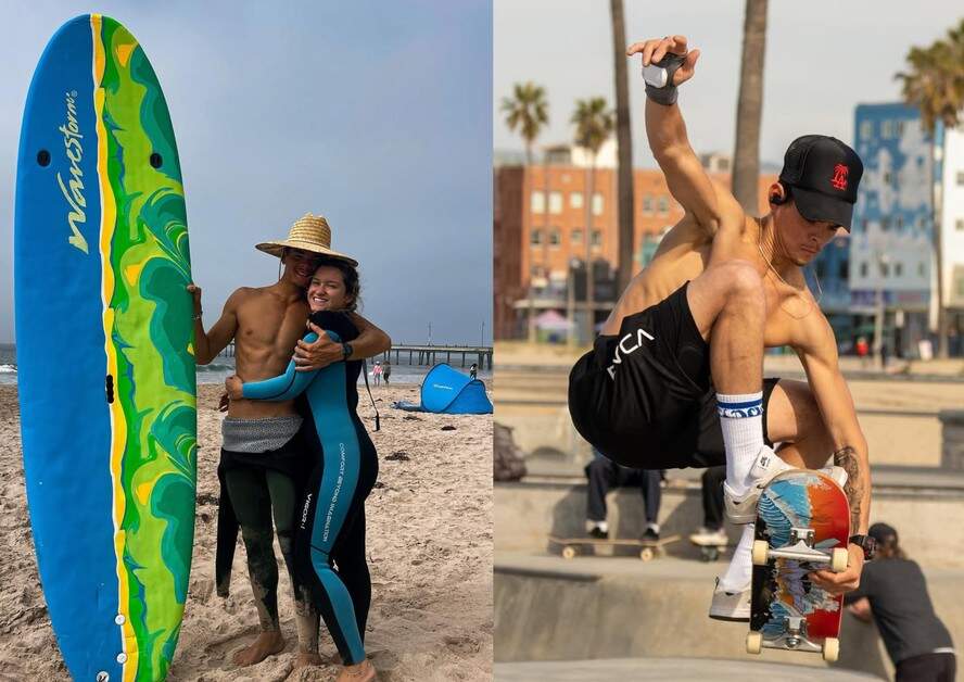 Além de ganhar a vida nas águas, Felipe também é skatista. Ele disputou seu primeiro campeonato em 2022. Marina também é uma grande fã do esporte, mas a filha de Gugu acompanha o namorado com patins, fazendo manobras radicais.