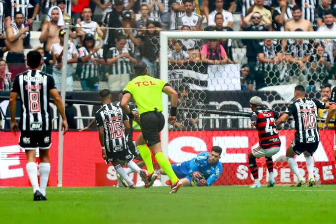 O primeiro tempo da decisão foi muito movimentado. O Atlético-MG teve mais posse de bola e dominou boa parte do jogo, mas o Flamengo assustou em vários ataques e tratou de equilibrar a partida. A melhor chance, inclusive, foi do clube carioca: uma cabeçada de Arrascaeta que tirou tinta da trave de Everson.