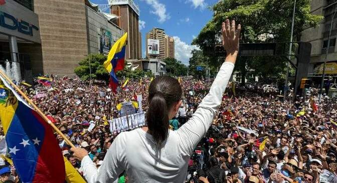 Acompanhada de outros dirigentes opositores, María Corina apareceu segurando uma bandeira da Venezuela e pediu uma mobilização permanente de seus apoiadores. “Este é o momento de cobrar, e o que significa cobrar? Significa que cada voto seja respeitado. (…) Que o mundo e todos dentro da Venezuela reconheçam que o presidente eleito é Edmundo González”, afirmou.