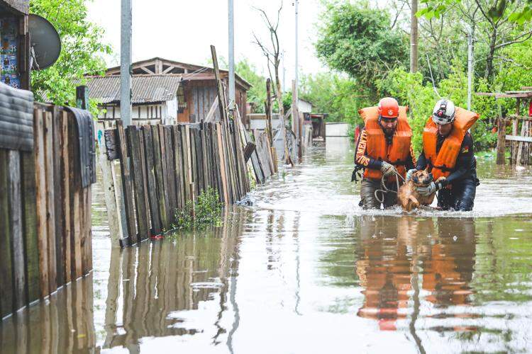 Equipes do Gabinete da Causa Animal, da prefeitura de Porto Alegre, realizaram na tarde desta terça-feira (26), o resgate de cães que estavam dentro de moradias atingidas pela enchente nas ilhas do Guaíba.