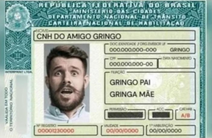 O titular do documento aparece com o nome de “CNH DO AMIGO GRINGO” e na filiação há os nomes “GRINGO PAI” e “GRINGO MÃE”. Os números de CPF e RG e as datas de validade e da primeira habilitação aparecem completamente zerados.