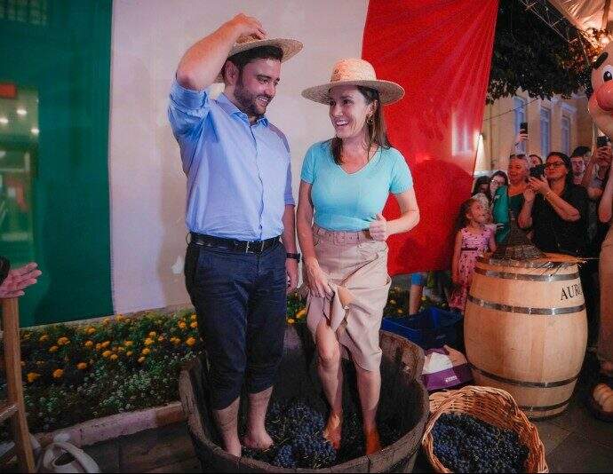 Durante o evento, Gabriel e a esposa, Talise Tiecher, participaram da tradicional “pisa da uva”. Responsável por uma das imagens mais emblemáticas da atividade, trata-se do ato de esmagar a uva com os pés, à moda antiga, dentro de um tonel de madeira, para extração do sumo que serve de base à produção de bebidas à base da fruta.