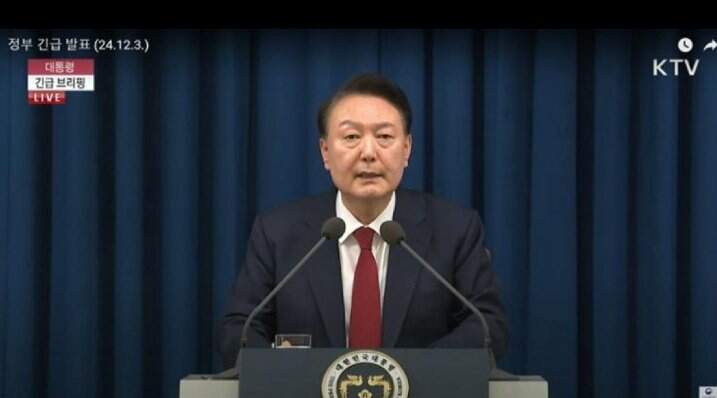 “Convoquei imediatamente uma reunião de gabinete, mas, como era de manhã cedo, o quórum para decisão ainda não foi alcançado, por isso suspenderei a lei marcial o mais rápido possível”, afirmou o presidente, antes de desferir críticas ao Parlamento, dominado pela oposição. “Peço à Assembleia Nacional que pare imediatamente com as ações ultrajantes que paralisam a função do Estado por meio de repetidos [pedidos de] impeachment, manipulação legislativa e manipulação orçamental.”