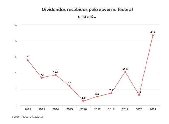 Em 2021, as empresas estatais federais pagaram R$ 101 bilhões a título de dividendos e juros sobre capital próprio relativos a anos anteriores e antecipação por conta do resultado do próprio exercício. Desse total, R$ 43 bilhões foram destinados à União, sendo que 98% desse valor foi proveniente dos grupos Petrobras (R$ 21,1 bilhões), BNDES (R$ 13,6 bilhões), BB (R$ 3,2 bilhões), Caixa (R$ 2,8 bilhões) e Eletrobras (R$ 1,3 bilhão).
