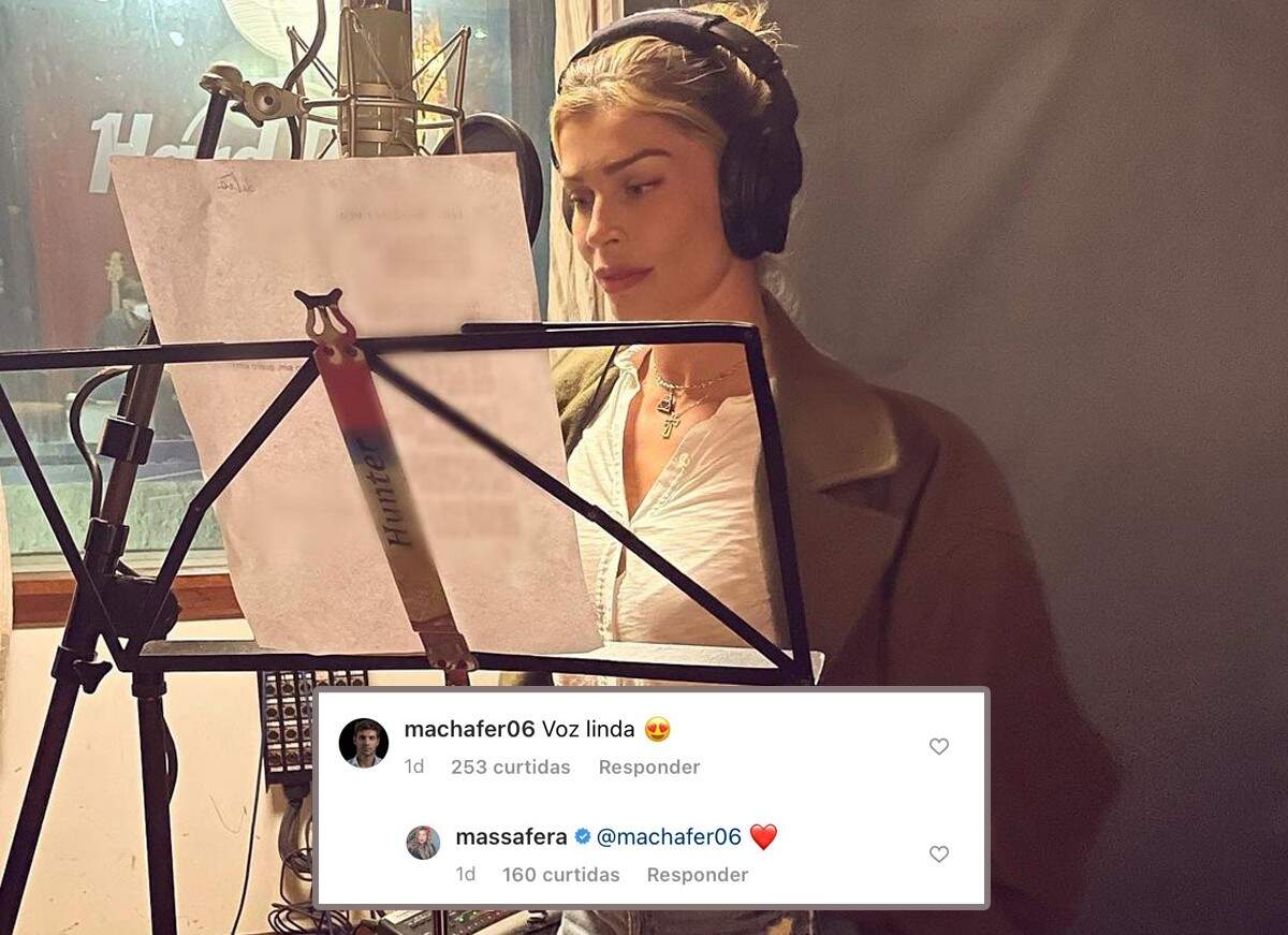 Neste domingo (21), por exemplo, a atriz publicou um clique em que aparece em estúdio de gravação e prontamente recebeu elogio do amado.