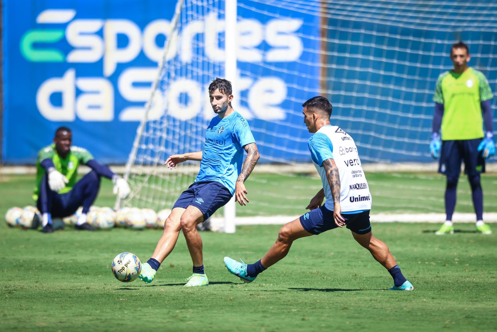 Logo depois, sob comando do técnico Renato Portaluppi e sua comissão técnica, os atletas participaram de um treino tático em campo reduzido com finalização no gol, exigindo bastante dos goleiros gremistas.