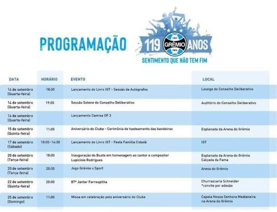 O Grêmio divulgou a programação oficial de sua comemoração de aniversário de 119 anos. A celebração tem início nesta quarta-feira (14) e se estende até 25 de setembro.