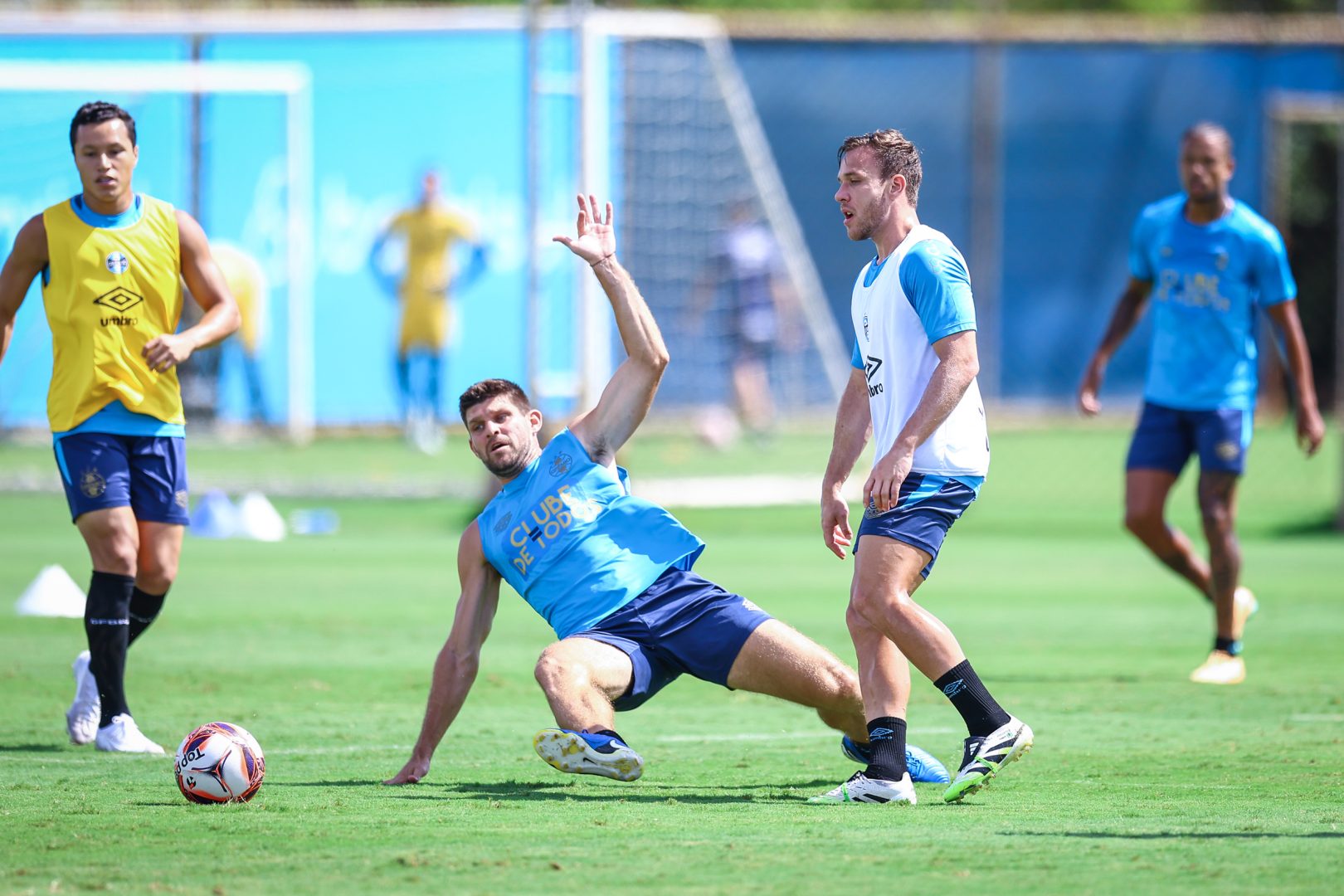 Na sequência, o técnico Luís Castro conduziu uma atividade técnica no Campo 2, priorizando a troca de passes e o controle da bola em espaço reduzido. O elenco foi dividido em três equipes, que se enfrentaram simultaneamente em metade do gramado. A proposta exigia intensidade, movimentação constante e rapidez nas decisões para manter a posse e escapar da pressão.