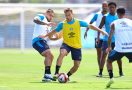 A movimentação em campo incluiu aquecimento focado nos membros inferiores, seguido de exercícios técnicos. Enquanto isso, os goleiros cumpriram uma rotina específica da posição sob orientação da preparação especializada.