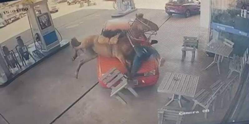 Em vídeos divulgados nas redes sociais, é possível ver um carro vermelho acelerando em direção a um homem que estava montado em um cavalo. O caso aconteceu na última sexta-feira (3) e é tratado como tentativa de homicídio.