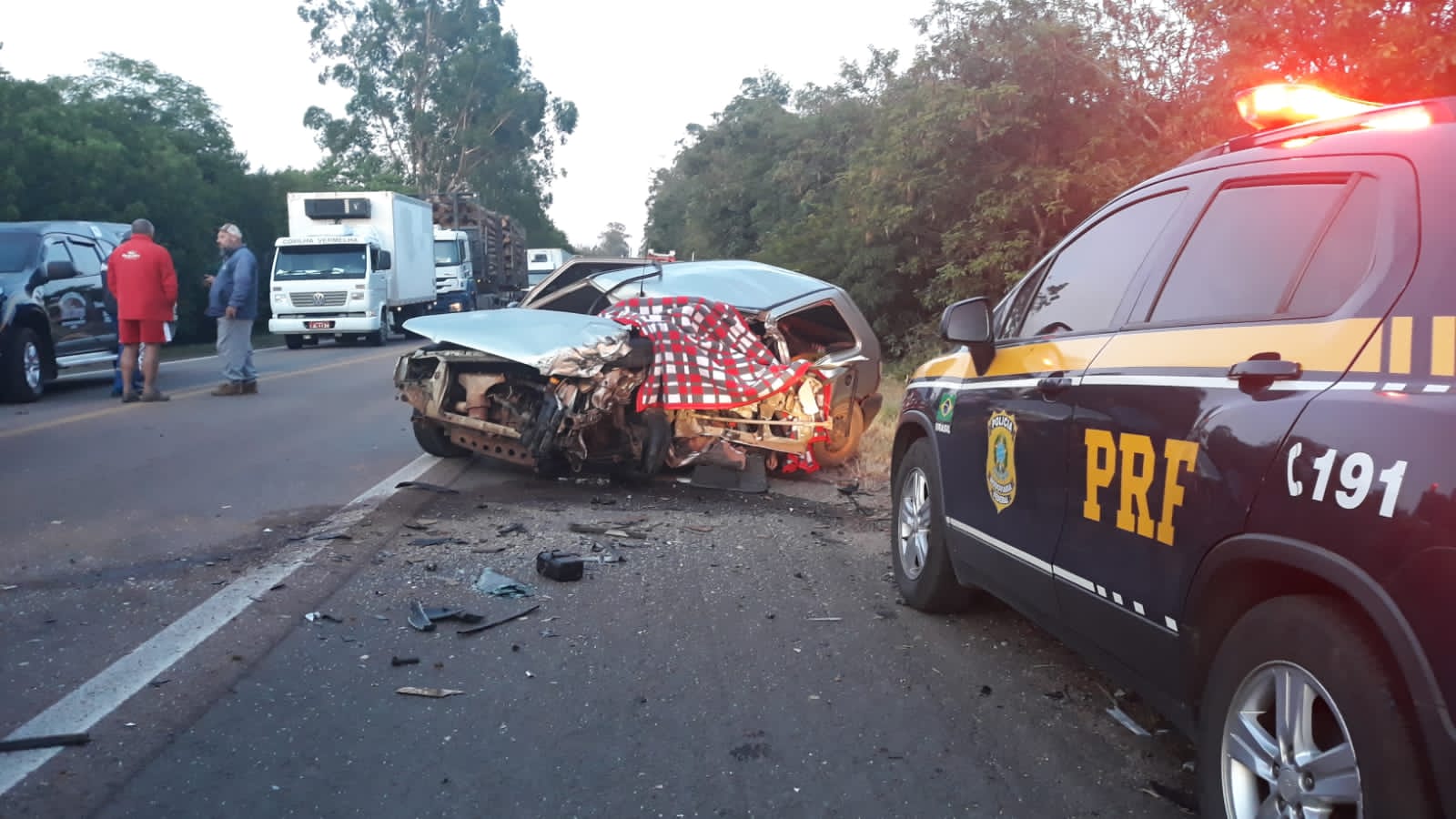 Conforme a PRF (Polícia Rodoviária Federal), a colisão frontal foi entre um Uno com placas de Santa Cruz do Sul que se deslocava no sentido interior e uma carreta de Santana do Livramento que ia no sentido Capital.