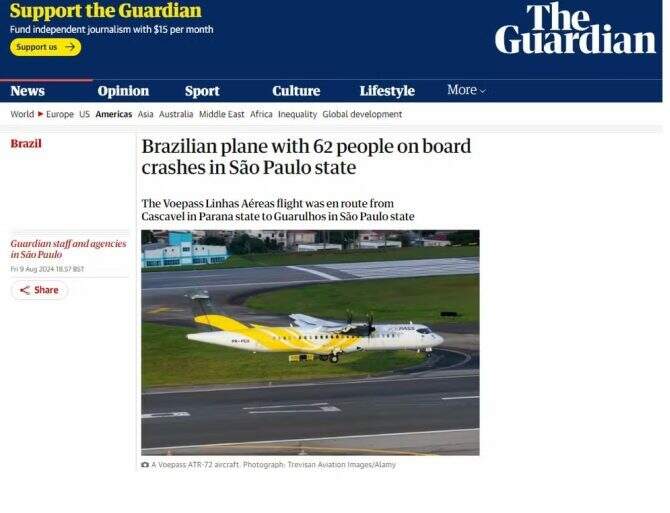 O jornal The Guardian, do Reino Unido, noticiou a queda do avião dizendo que as equipes estão no local do acidente e que o modelo do avião é um turboélice modelo ATR-72, segundo a Voepass Linhas Aéreas, companhia aérea dona da aeronave.