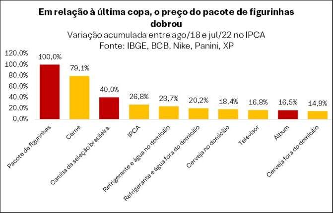 E, se a ideia é fazer churrasco para acompanhar os jogos, os brasileiros desembolsarão, em média, 80% a mais para comprar a carne, 18% para cerveja e 24% para refrigerante e água. “A alta do primeiro item está associada à maior demanda global, elevação dos custos de grãos e queda da área de pastagens com a crise hídrica de 2020/2021. Cerveja e refrigerante, em paralelo, tiveram alta relevante de custos, especialmente de embalagens, com cotação em dólares”, explica o líder regional da XP Rio Grande do Sul, Rafael Carmo.