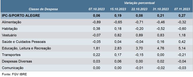 Além de Porto Alegre, o IPC-S aumentou em outras quatro das sete capitais pesquisadas pela FGV na primeira semana de novembro.