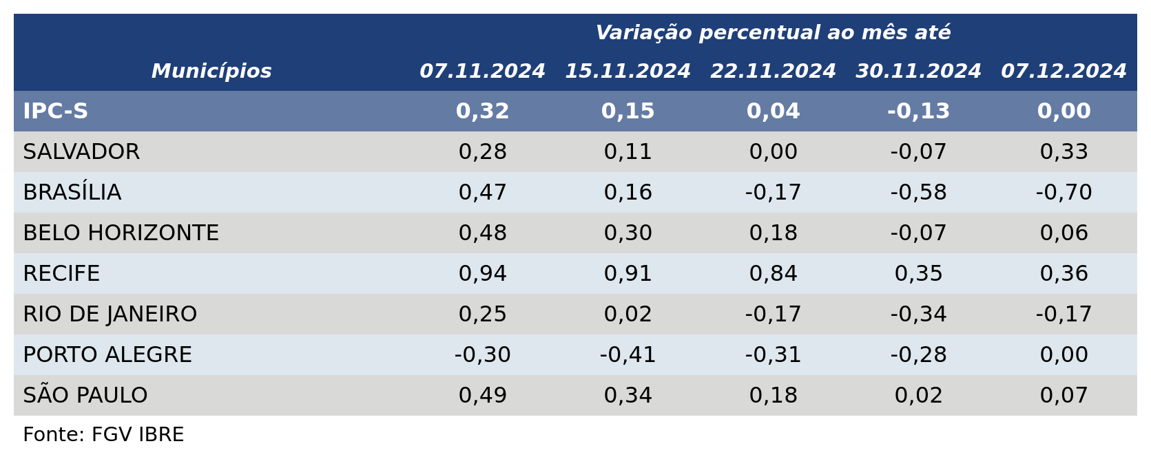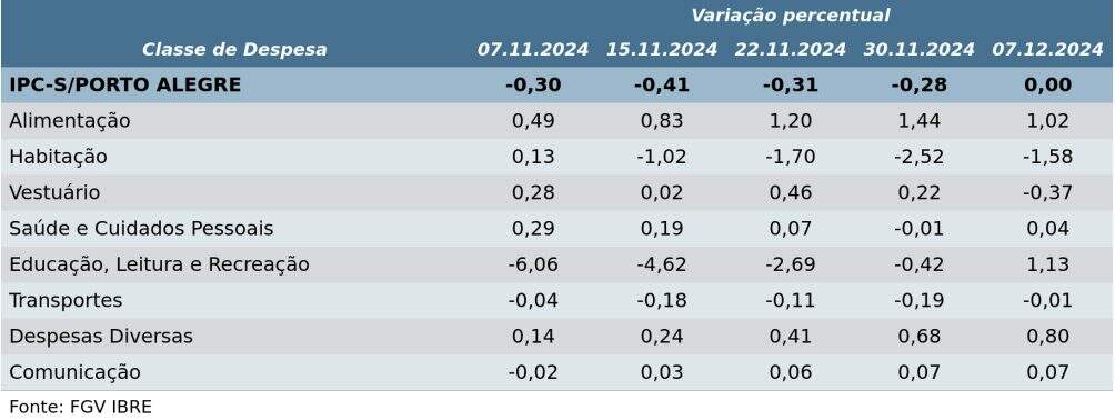O IPC-S (Índice de Preços ao Consumidor – Semanal) passou de -0,28% para 0% em Porto Alegre na primeira semana deste mês, segundo dados divulgados pela FGV (Fundação Getulio Vargas).