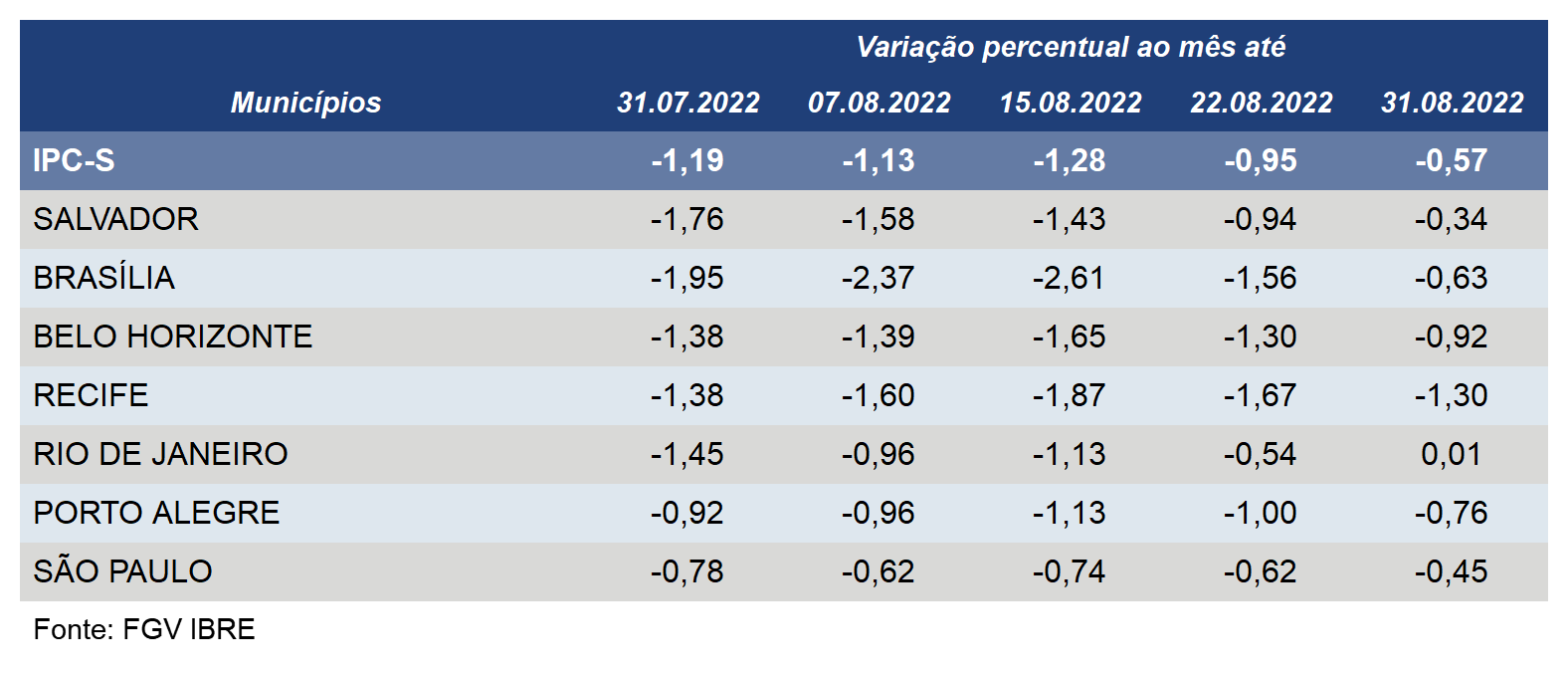 O IPC-S (Índice de Preços ao Consumidor – Semanal) variou -0,76% em Porto Alegre na quarta semana de agosto. Na semana anterior, o índice havia ficado em -1%. Com o resultado, a inflação para o consumidor acumula alta de 6,77% nos últimos 12 meses na Capital gaúcha.