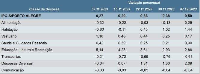 O IPC-S (Índice de Preços ao Consumidor – Semanal) aumentou de 0,38% para 0,59% na primeira semana deste mês em Porto Alegre, segundo dados divulgados pela FGV (Fundação Getulio Vargas).