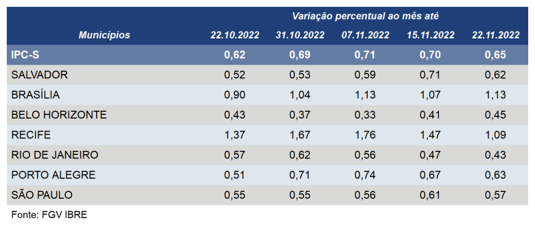 Além de Porto Alegre, o IPC-S desacelerou em outras quatro das sete capitais pesquisadas pela FGV na terceira semana de novembro.