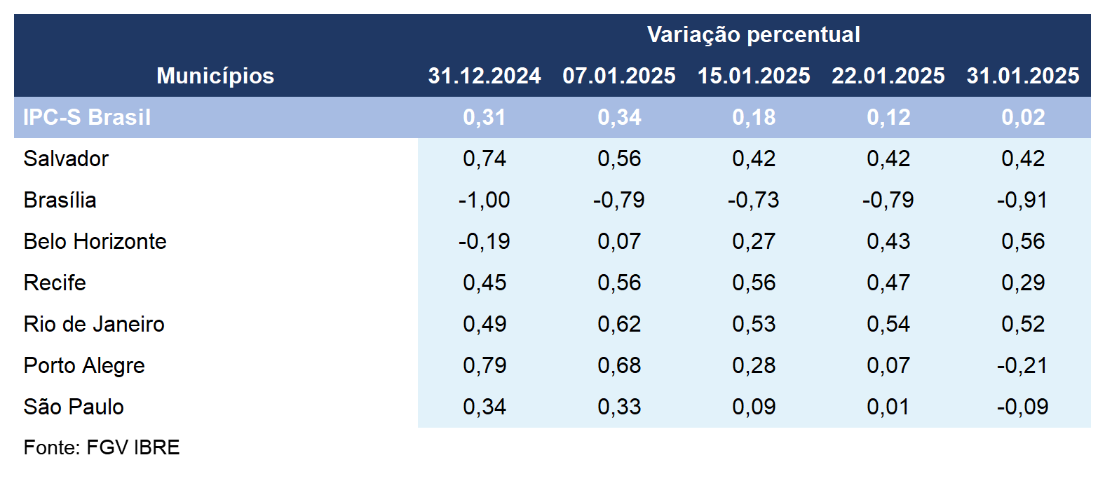 O IPC-S (Índice de Preços ao Consumidor – Semanal) recuou de 0,07% para -0,21% em Porto Alegre na última semana de janeiro, de acordo com dados divulgados pela FGV (Fundação Getulio Vargas).