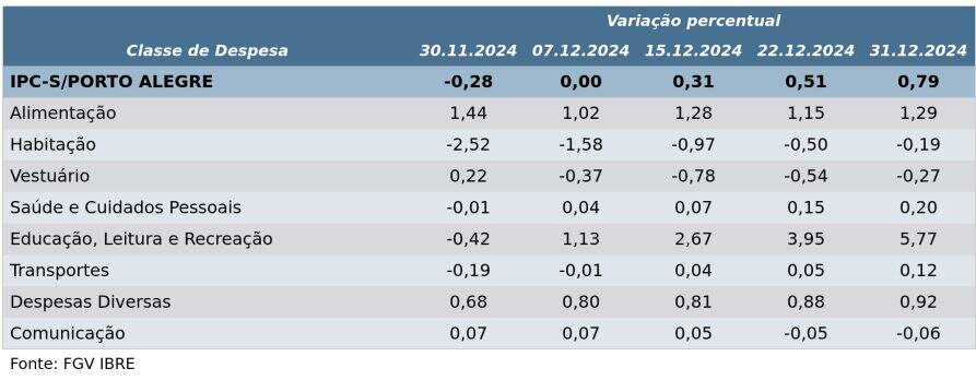 O IPC-S (Índice de Preços ao Consumidor – Semanal) aumentou de 0,51% para 0,79% em Porto Alegre na última semana de dezembro, segundo dados divulgados nesta sexta-feira (3) pela FGV (Fundação Getulio Vargas).