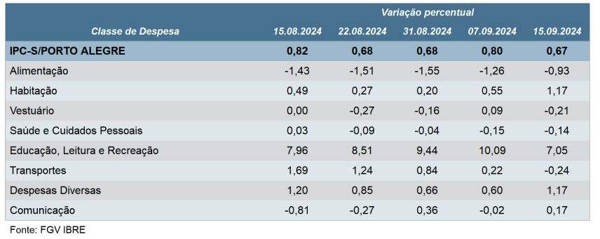 Nesta apuração, três das oito classes de despesa componentes do IPC-S apresentaram desaceleração em suas taxas de variação, entre as quais se destacam os grupos educação, leitura e recreação e transportes, cujas taxas passaram de 10,09% para 7,05% e de 0,22% para -0,24%, respectivamente. A alimentação variou de -1,26% para -0,93%.
