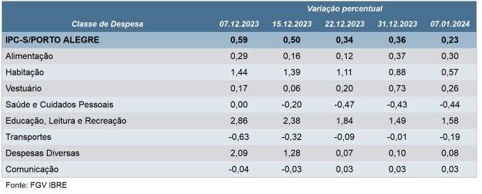 O IPC-S (Índice de Preços ao Consumidor – Semanal) variou 0,23% em Porto Alegre na primeira semana deste ano. O resultado é 0,13 ponto percentual menor do que o registrado na semana anterior, segundo dados divulgados nesta terça-feira (9) pela FGV (Fundação Getulio Vargas).